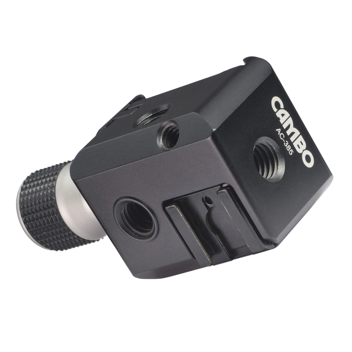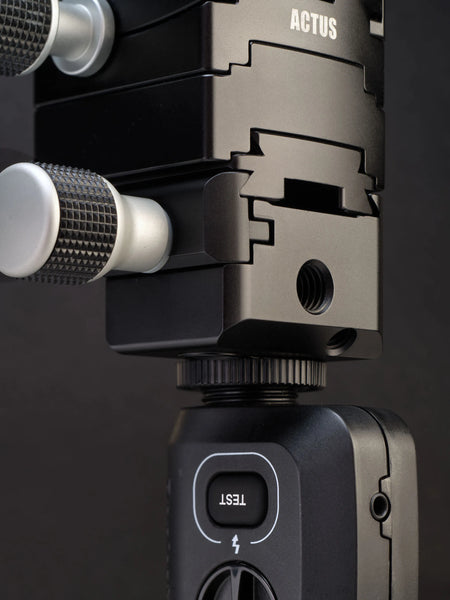 The AC-385 accessory holder attaches directly to the Arca style monorail of the Actus view cameras. It offers three 3/8" and two 1/4" attachments and a cold shoe. The latter comes in handy to attach a flash trigger.