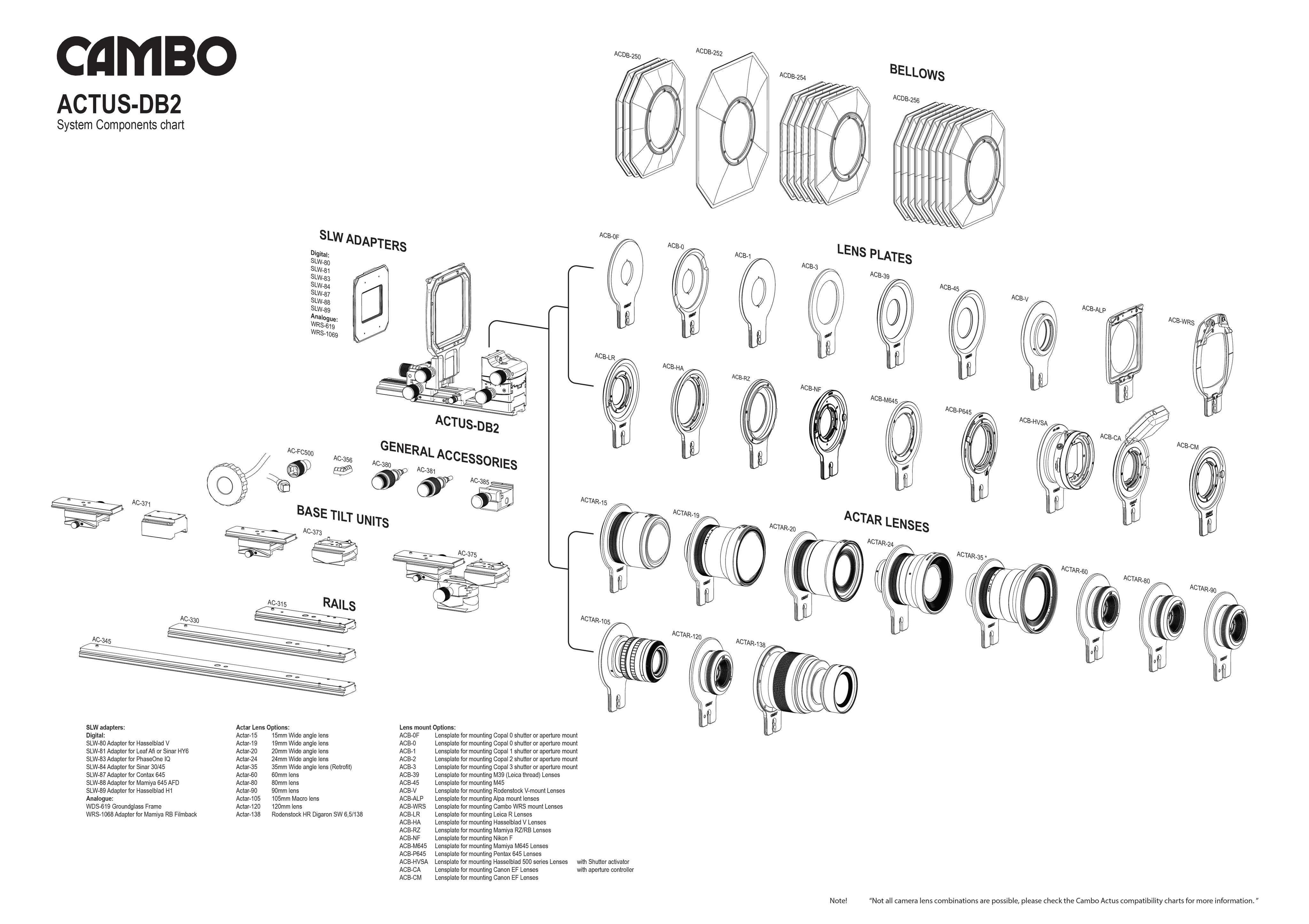 The Cambo ACTUS-DB2 is an evolution of the ACTUS-Mini series for mirrorless cameras and DSLR's. It's the version for use with Digital Backs. Thanks to a plethora of adapters it accepts modern CMOS backs, like Hasselblad CFV-100 and Phase One IQ4, just as well as most legacy backs.