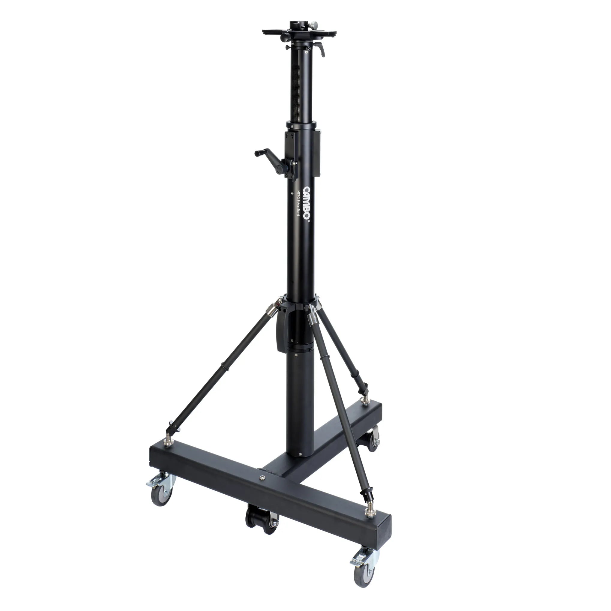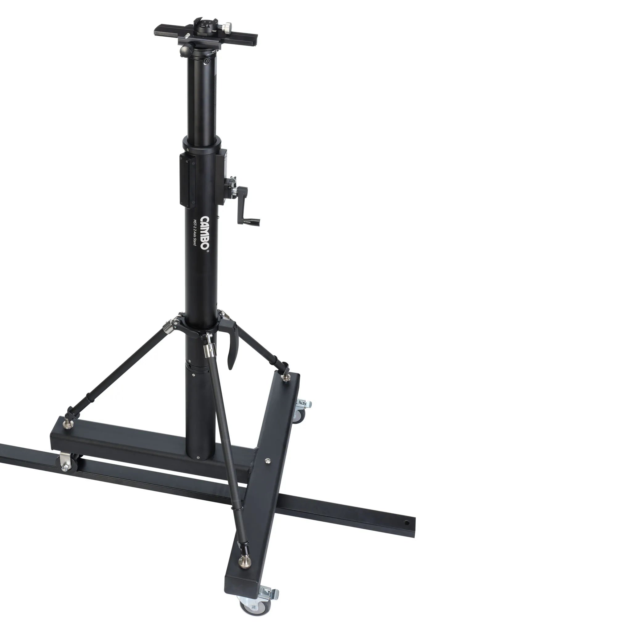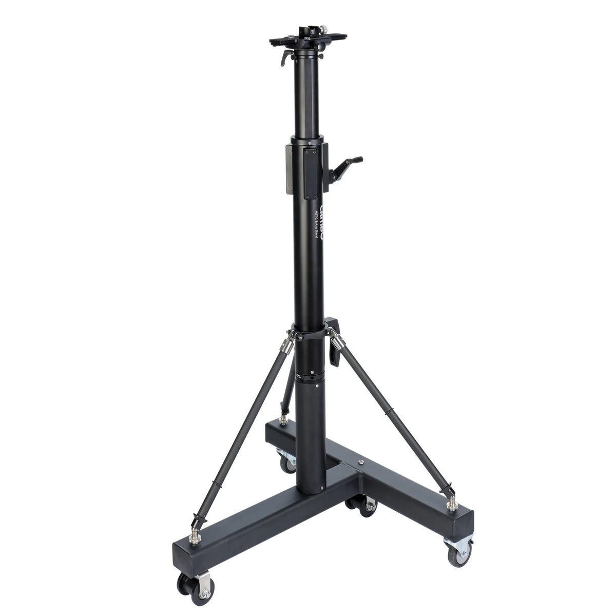 The MST column combined with the larger base with added track wheels. This is for use on a mono track, like used in art reproduction studios. The top of the column has a V-Groove which accepts various adapters. Height adjustment is by crank and can be locked, although the mechanism is self-locking. If needed the column can be extended by 15 and 30cm segments.