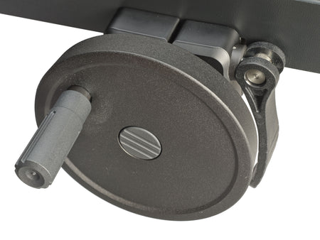 A hand wheel positioned at table level controls the spindle-driven height adjustment system, allowing smooth and precise camera positioning. Because the crank is located at a comfortable working height, adjustments can be made without reaching over the baseboard or touching the camera—minimizing vibration and maintaining perfect framing. The mechanism operates smoothly and accurately, making it ideal for fine focus adjustments through controlled height changes.